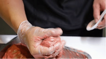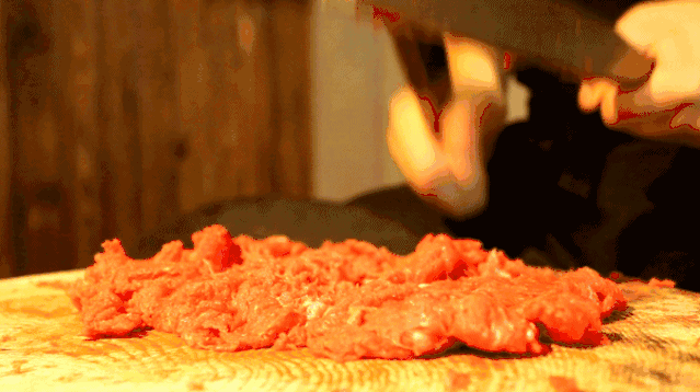 30分钟后,牛肉的颜色从鲜红慢慢变得粉红,牛肉泥产生明显的粘稠感。
