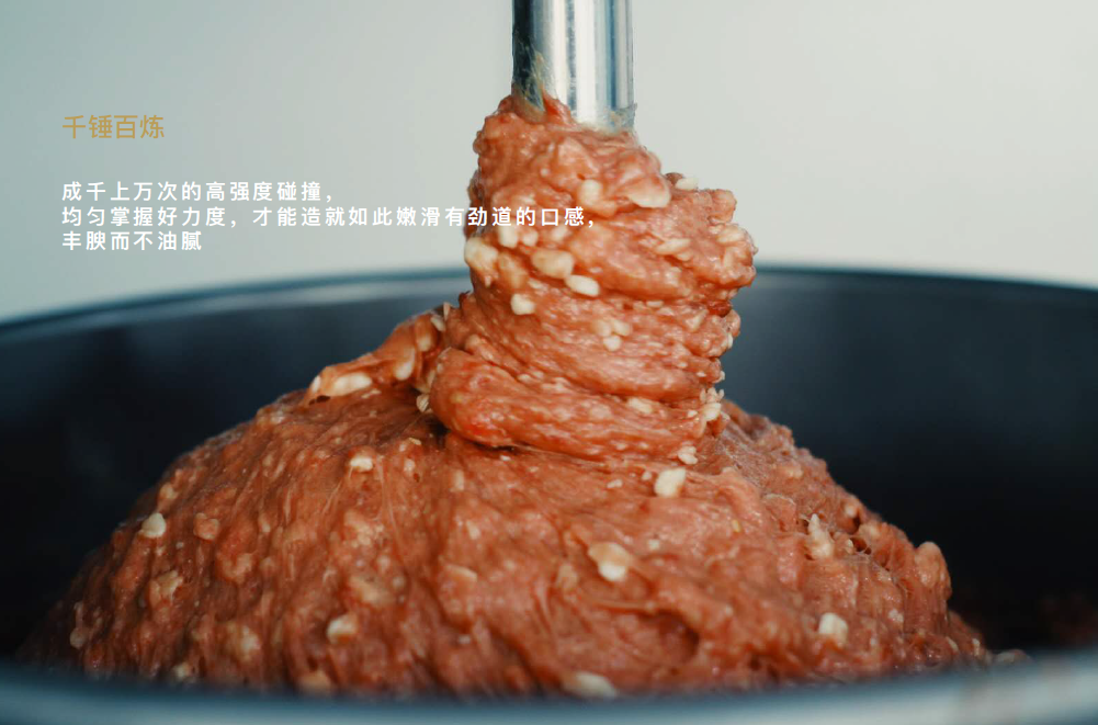 反复的捶打使得牛肉的肌肉蛋白不断延展,捶打时细心挑出其中的肉筋,保证牛肉丸口感的一致性。