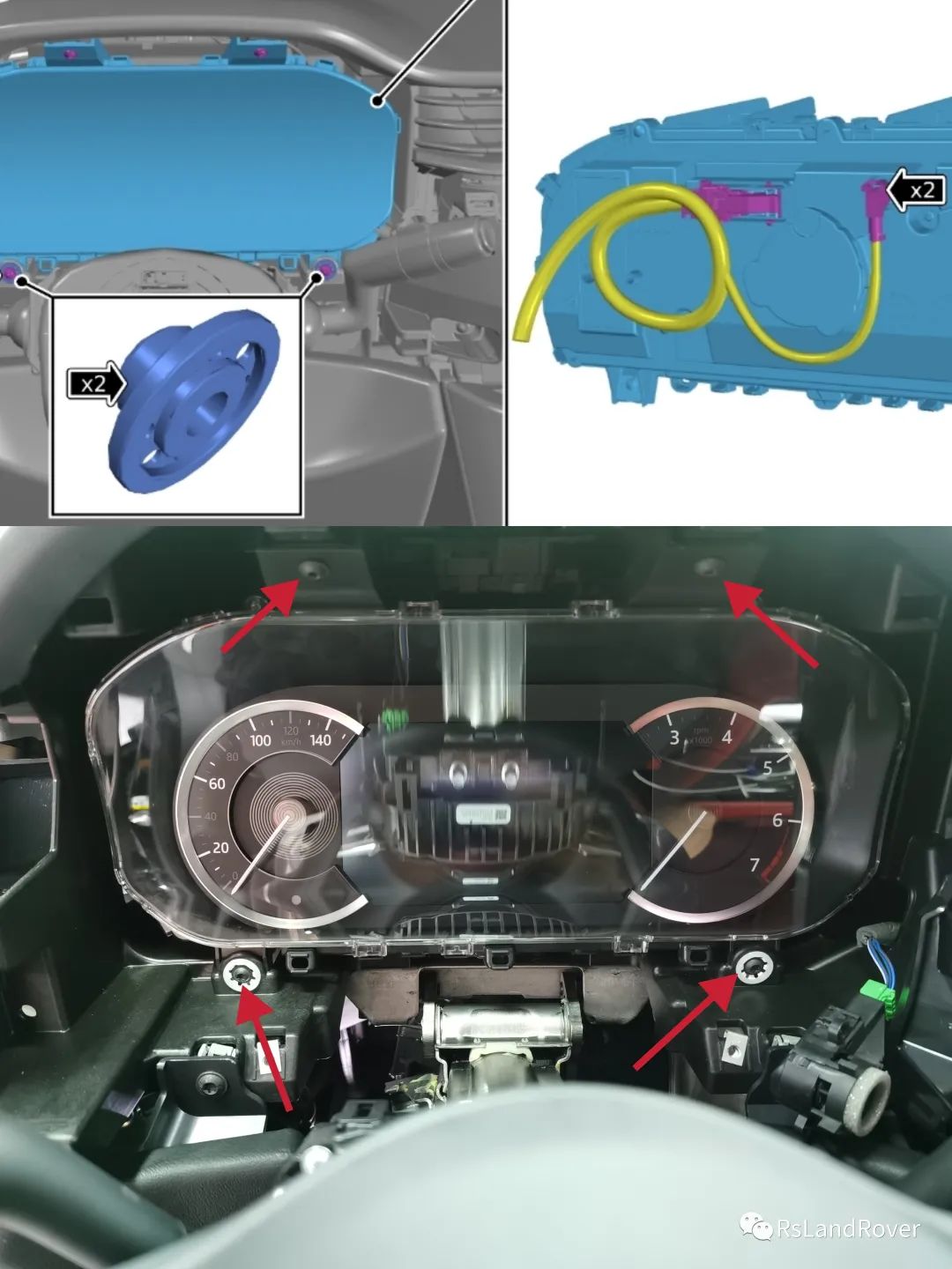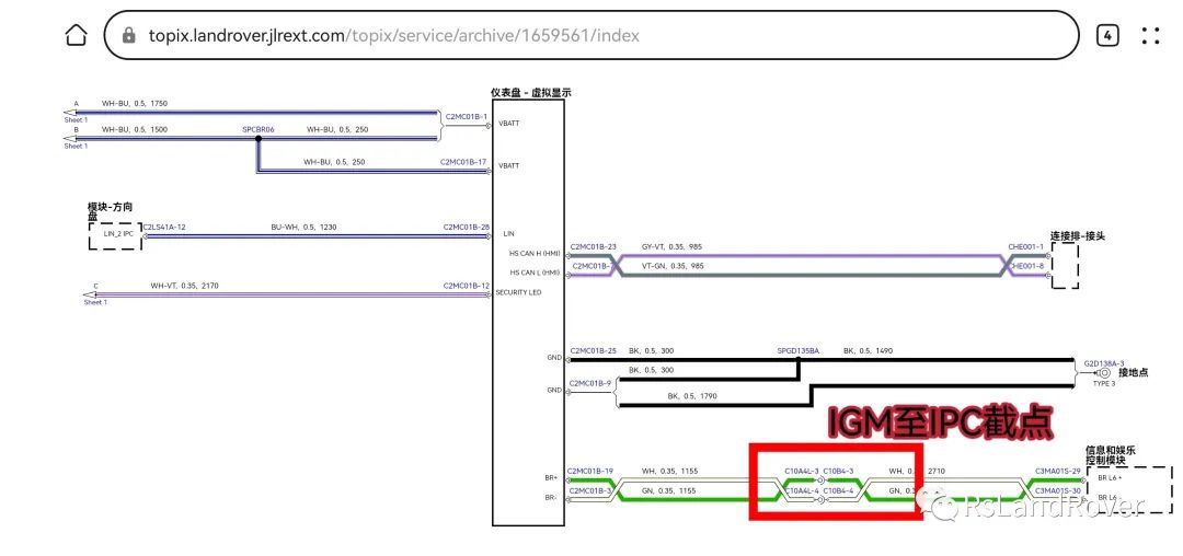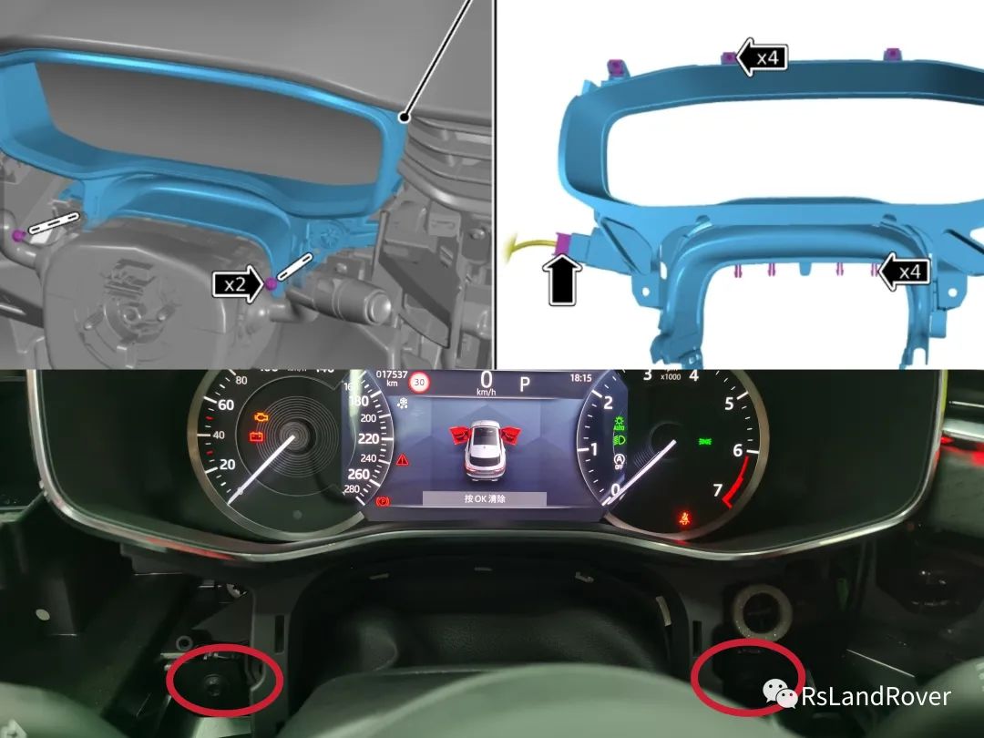 7:拆卸主驾驶侧出风口,与氛围灯一起拆卸,不需要单独拆卸氛围灯条,T25螺丝×39:由于小风扇插头位置并不太好拔掉,所以选择拆卸T25螺丝×2 将其放置一旁(注意避免受损)10:拆卸仪表外侧饰板框架 T25螺丝×2 卡扣×411:拆卸框架后,拆卸仪表组总成,T25螺丝×4,插头×2,图中白色垫圈×2不要丢弃,将安装新仪表组继续使用。12:拆卸主驾座椅与副驾座椅,拔掉副驾座椅插头,找到副驾驶座椅下IGM模块C3MA01S插头13:将原车IGM插头针脚29.30针脚使用卡针把原车针脚29.30号取出,使用胶带包扎绝缘,包扎好固定不再使用,将产品所带线束针脚分别插入IGM模块插头29.30针脚14:将产品线束使用黑色布胶带包裹好,使用穿线器从马鞍底部穿过到达主驾驶,直至仪表插头(线束走向仅供参考)15:将产品线束针脚3.19分别插入仪表组插头(原车3针脚9针脚为空腔直接插入即可)(针脚号产品线束会有特别标注)16:由于高配全液晶仪表插头17号为供电,低配仪表插头17号为空腔,则将原车仪表插头1号针脚取出,插入产品一分二转接插头,将产品两根插针分别插入原车1针脚与17针脚,完毕后将新仪表组进行软件编程,测试完毕后,将插头进行包裹,避免异响磨损损坏,反向全部安装饰件即可(*细节避免异响*)18:原车IGM模块29.30针脚有线束,说明厂家可能有预留至仪表组线束,但可能只到了截点处,截点处至仪表缺少线束