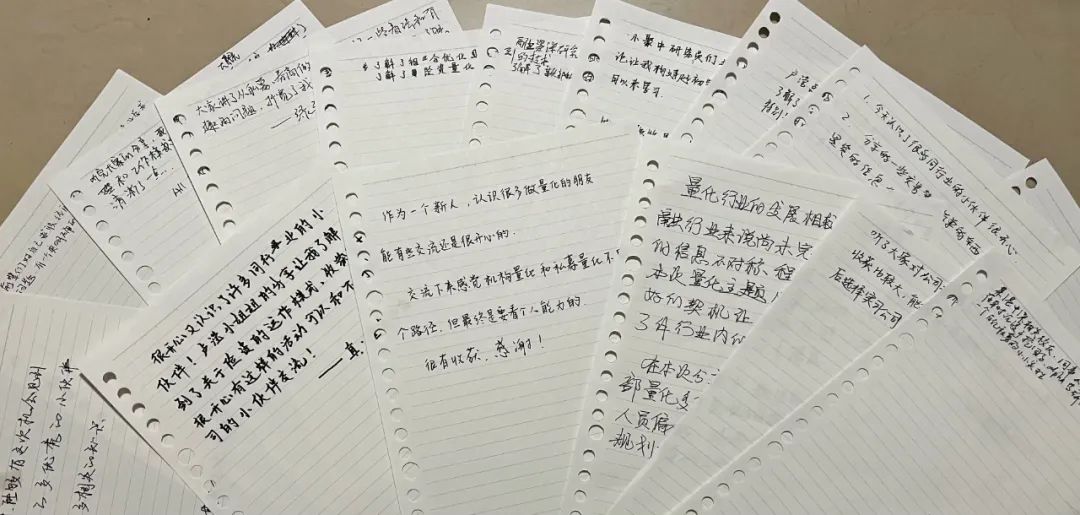 1.今天认识了很多行业的小伙伴很开心。2.分享的一些交易算法拆单的东西以及险资的信息也很有收获。——某50e QR实习小白某港中深相关校友关于组合优化的发言给我较为深刻的印象,在平时沉浸于挖因子、alpha等研究之外,提供了新的学习思路与方向!——一个百亿私募的小小实习生了解了私募生态和规模等级,对私募内部职级和业务模式有了理解。——北京券商Quant Dev两位资深研究员的发言令人印象深刻,知道了一些还未接触到的技术,了解了某头部私募的运作模式。——某量化研究员