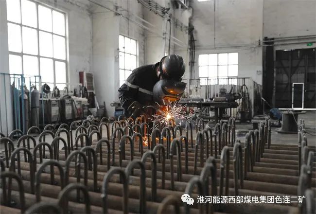 图为公司安装准备队电焊工正在为12405工作面设备列车加工管揽托架。