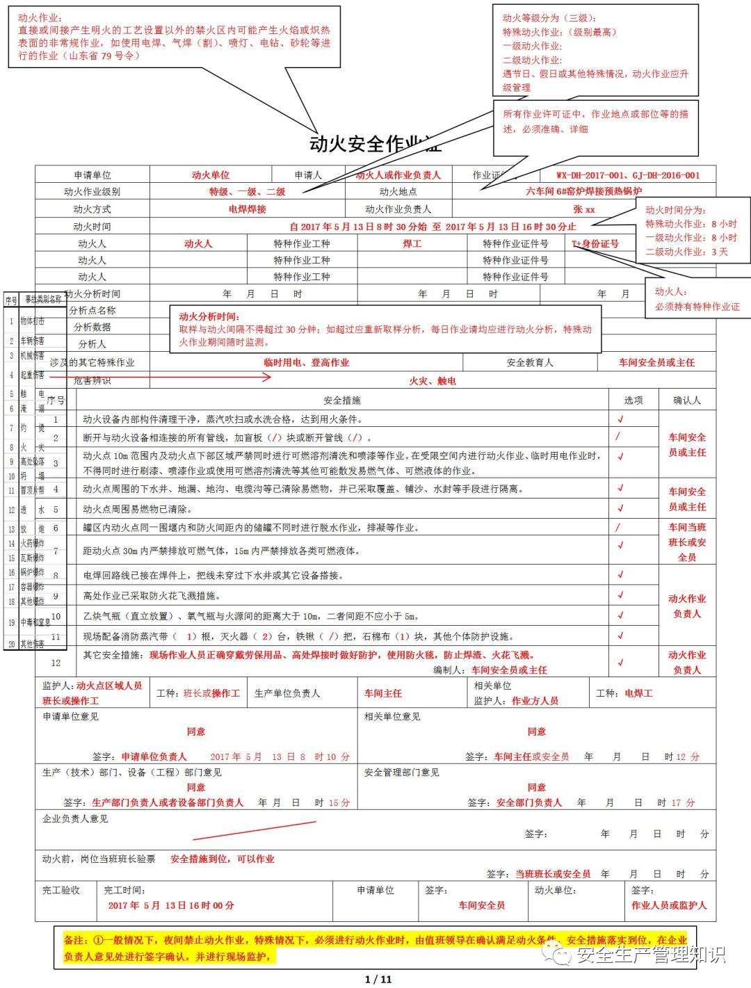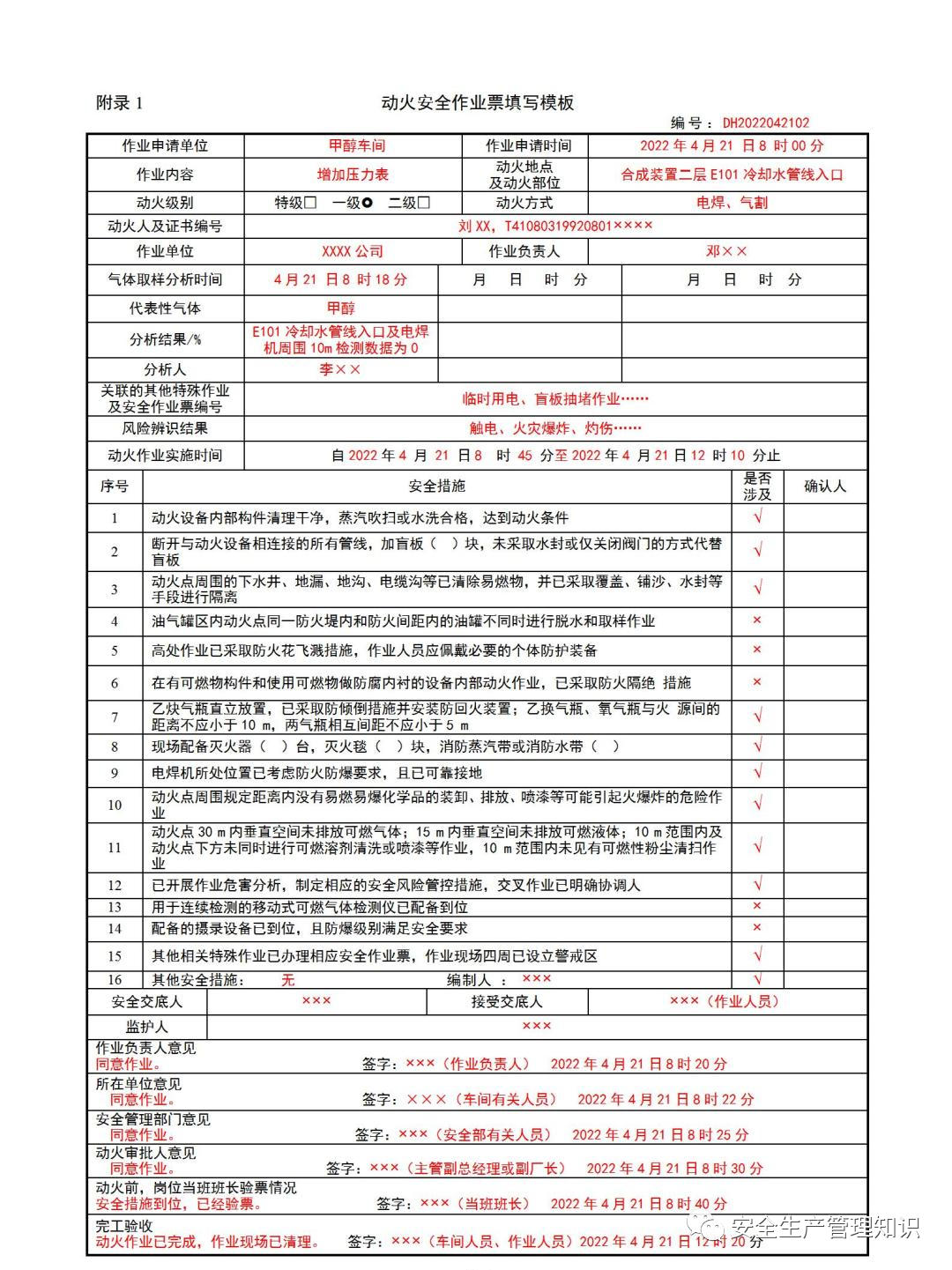 为严格落实《危险化学品企业特殊作业安全规范》(GB30871-2022),强化特殊作业安全管控,规范危化品企业特殊作业票证填写和审批,有效防范特殊作业引发的生产安全事故,结合去年以来特殊作业票线上审查发现的普遍性、典型性问题,省厅编制了《危险化学品企业特殊作业票证填写注意事项》,现印发你们,并提出如下要求,请认真组织实施。一、自2023年6月1日起,所有重大危险源企业全部实行特殊作业票线上办理,采用特殊作业电子票。特殊作业电子票的内容应符合《危险化学品企业特殊作业安全规范》(GB30871-2022)要求,电子票格式参照《危险化学品企业特殊作业安全规范》(GB30871-2022)的样票格式和《危险化学品企业特殊作业票证填写注意事项》要求,结合企业实际进行设置,进一步规范特殊作业票填写和审批,不得有缺漏项。二、各设区市应急管理局要督促化工(危化品)企业组织开展《化学品生产单位特殊作业安全规范》(GB30871-2022)培训宣贯,要严格特殊作业安全知识考核,严把培训考核质量。要督促企业依照规范和标准完善特殊作业管理制度,严格作业票审批制度,强化风险管理。三、各设区市应急管理局要强化动火等特殊作业的监督管理,实行线上线上协同监管,将动火等特殊作业检查作为日常安全检查的重点,并开展有针对性的明查暗访,严厉打击特殊作业环节中的违规行为。在特殊作业环节发生事故的企业,要严格依法暂扣其安全生产许可证或责令其停业整顿;对于不能满足安全生产条件的企业,要依法吊销其安全生产许可证,报请地方政府予以关闭退出。 1.作业申请单位是指危化品企业中需要动火的属地单位或部门,不应是承包商或其他实施动火作业的单位。2.当本单位的动火作业可能影响到相邻单位时,应在动火安全作业票设置会签单位栏,并由受影响的相邻单位会签。若对相邻单位无影响,则不需要填写。3.动火人是指负责具体实施动火作业的人员。涉及电焊、热切割等特种作业时,应填写动火人的特种作业操作资格证号。不涉及特种作业时,则不填写特种作业证号。4.监护人是指由动火作业申请单位安排且经过危化品企业内部监护人安全培训合格,取得安全培训合格证(监护资格证)的人员。如要求动火实施单位增派监护人,该监护人应经危化品企业监护人培训合格。办理动火安全作业票时,应填写其安全培训合格证(监护资格证)证号。5.填写气体分析结果时,应同时填写气体采样部位。若在管道、设备、塔器等设备本体上动火,应填写动火点10m范围内环境气体分析结果及动火设备、管道、塔器内可燃气体分析结果。若在设备及管道外部环境动火,应填写动火点10m范围内可燃气体分析结果。若使用电焊机作业时,电焊机与动火点的间距不应超过10m,并在气体采样部位注明。如果电焊机等非防爆电气设备距离动火点超过10m,则应将电焊机等非防爆电气设备视为另外一个动火点,需要对电焊机等非防爆电气设备10m范围内进行可燃气体分析,并记录动火点及电焊机等非防爆电气设备周边的可燃气体分析结果。涉及在氧气设备及富氧环境动火作业时,应填写氧气检测分析结果。6.代表性气体是指动火作业部位或动火区域内可能存在的可燃气体、有毒气体的具体名称,如丙烷、甲醇、氯气、等。若动火点不涉及可燃、有毒气体,代表性气体填写为不涉及可燃或有毒气体。涉及在氧气设备及富氧环境动火作业时,代表性气体填写氧气。7.应逐条确认安全措施,在是否涉及栏中填写是或否。安全措施中带括号的应填写具体数量,不涉及的填写0。需要补充的其他安全措施,由编制人填写并签名,并由确认人确认后签名。8.企业动火作业安全管理制度应明确安全措施的确认人,由基层单位的作业监护人、班组长及以上人员担任,不能由同一个人对所有的安全措施进行确认签名。9.安全交底人是指动火申请单位的动火作业所在基层单位的现场负责人。10.接受交底人是指参与实施动火作业的所有人员,包括动火人、作业负责人、监护人、辅助作业人员。11.《危险化学品企业特殊作业安全规范》(GB30871-2022)样票中的作业负责人是指负责实施动火作业单位的作业现场负责人,签票时应填写同意动火的意见并签名,时间填写到分钟。12.所在单位意见是指动火申请单位的意见,签票时应填写同意动火的意见并签名,时间填写到分钟。13.安全管理部门意见是指公司、分厂的安全管理部门的意见。由专职安全管理人员负责填写同意动火的意见并签名,时间填写到分钟。14.动火审批人意见是指具有审批动火安全作业票资格的相关人员的意见,在审批时应填写同意动火意见并签名,时间填写到分钟。特级动火安全作业票由企业主要负责人审批或临时授权审批人(分管生产、技术、安全负责人、总工程师、安全总监,授权审批采用一次授权方式,并且授权人应指派专人进行动火作业现场的监督管理。一级动火安全作业票由企业分管生产、安全负责人或安全总监审批;企业设立分厂、运行部的,可以由分厂、运行部的负责人、分管生产、设备、技术的负责人审批;二级动火安全作业票由企业属地负责人审批。15.所有审批的时间均应在动火分析合格结果出来之后,不得在动火分析时间前进行审批。16.由监护人和作业申请单位负责人验收,完工验收时间早于作业结束时间相同。1.作业申请单位
