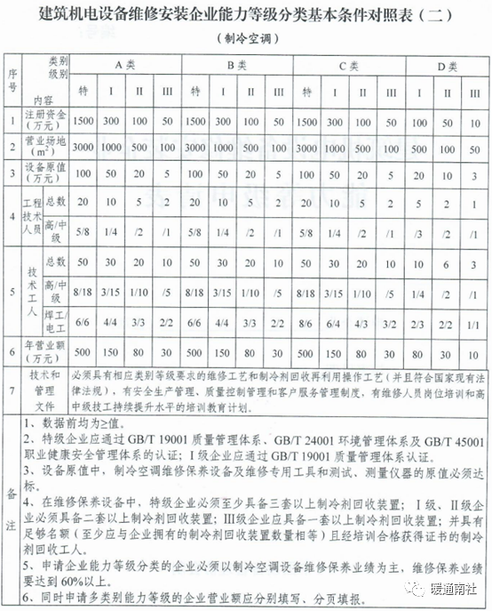 制冷空调设备维修安装企业能力等级认证等级基本条件表(见附表)