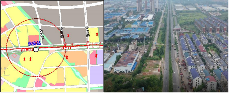 永安南站位于新河南路与新建路交叉口北侧。车站东侧为已建华域视觉科技有限公司、在建湖南安驰新能源项目等,车站西侧为蓝思科技,东侧是公租房小区。