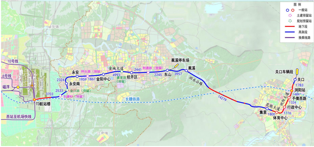 新建车站15座,其中高架站8座、地下站4座、土建预留站3座,平均站间距3.24km,另外,规划预留车站2座。新建蕉溪停车场和关口车辆段,新建主变3座,利用长沙磁浮快线车辆段控制中心。