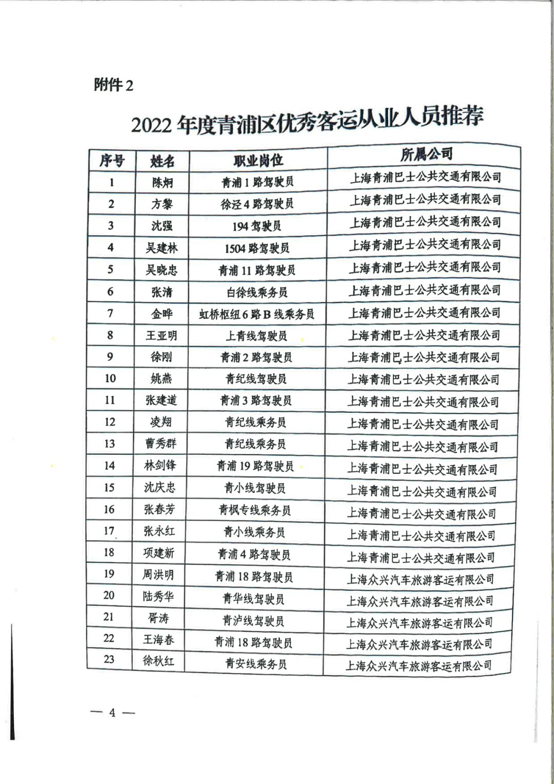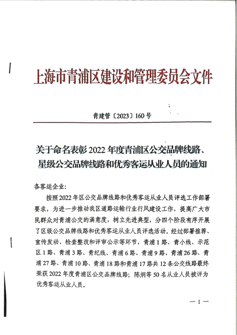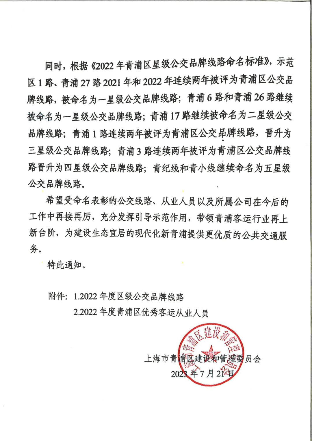 近日,区建管委印发了《关于命名表彰2022年度青浦区公交品牌线路、星级公交品牌线路和优秀客运从业人员的通知》,公司5条线路、18名司乘人员获得表彰。