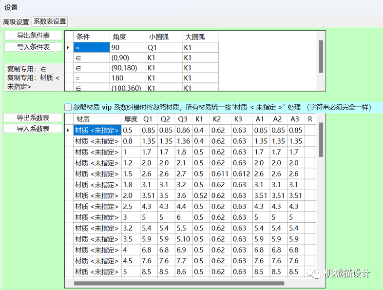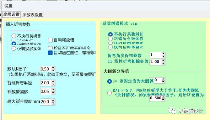 选择单实体、多实体以及自动避过圆柱、螺栓等零件。可选择k因子、折弯半径、释放槽便宜量、钣金最大厚度、圆弧分界值等所需校验的参数。可根据不同材质校验钣金弧度、角度等