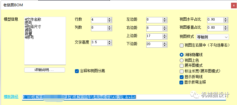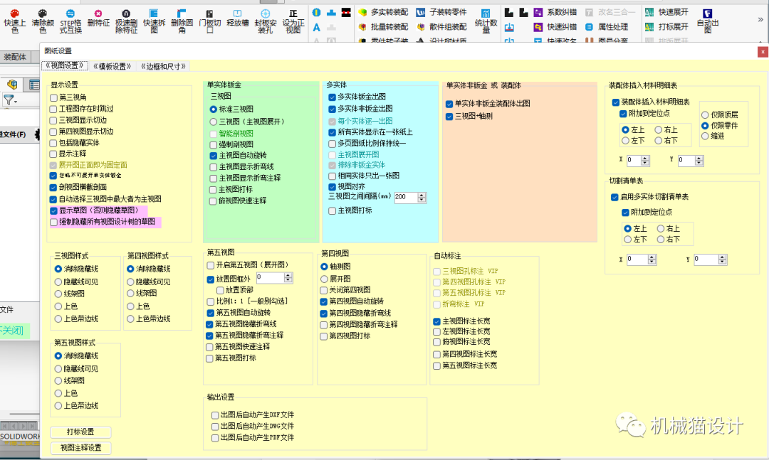 可对单/多实体钣金、非钣金、装配体的三视图、第四、第五视图的展开图纸进行配置,包含:打标、折弯、注释、材料明细、切割清单表、自动标注、选择输出格式等