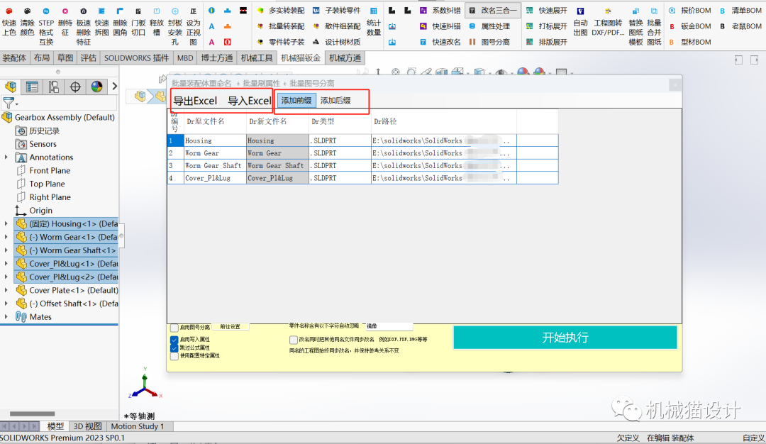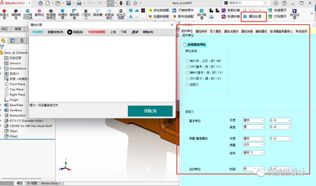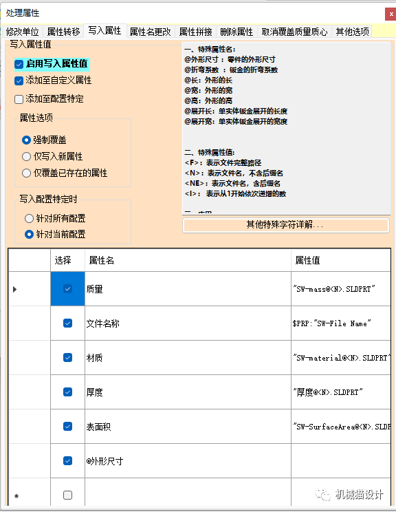 对装配体、零件等文件的属性进行批量处理,包含:批量修改单位、属性转移(切割清单可选)、批量写入属性(如:长、宽、高、质量、外形尺寸、折弯系数等)、属性批量修改、属性批量拼接、批量删除属性等