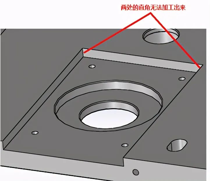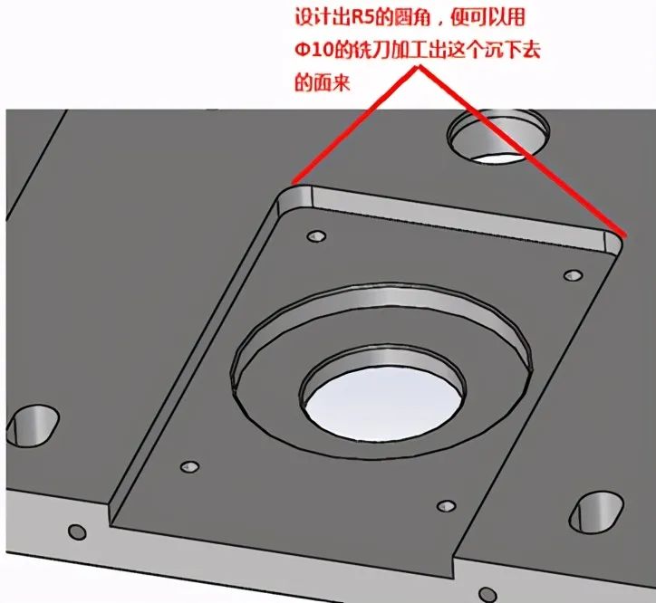 注:如图1中的设计没有考虑工艺圆角,其形状只能用电火花加工或其余特种加工手段才可加工出来,常规加工手段是做不出来的,如设计成图2所示形状留有工艺圆角,便可线铣出沉阶面,再用Φ10的铣刀清角即可,这样便于加工节省成本!