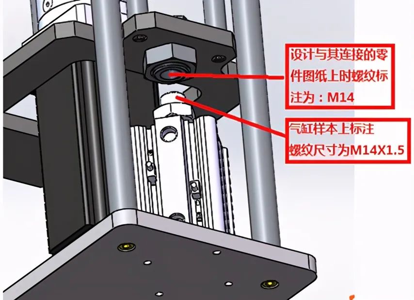 注:M14标注表示为普通粗牙螺纹,其螺距为2,因此装配时螺纹与外购件不匹配,此案例最终导致设计的连接件报废。