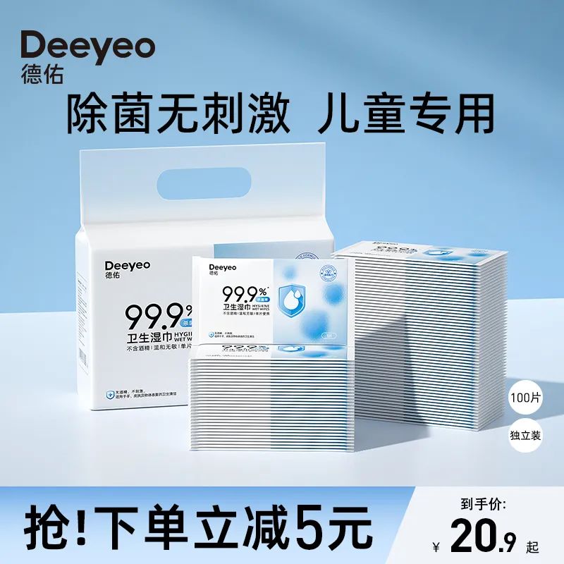 (广告) 德佑杀菌湿巾非酒精便携式单片装儿童学生消毒卫生湿纸巾100片