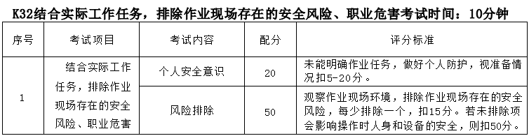 结合实际工作任务,排除作业现场存在的安全风险、职业危害(简称K32);