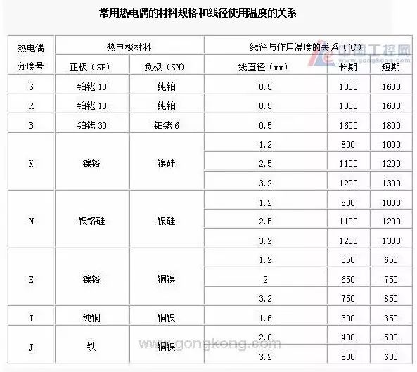 按照补偿导线所匹配的热电偶的品种列于表1。