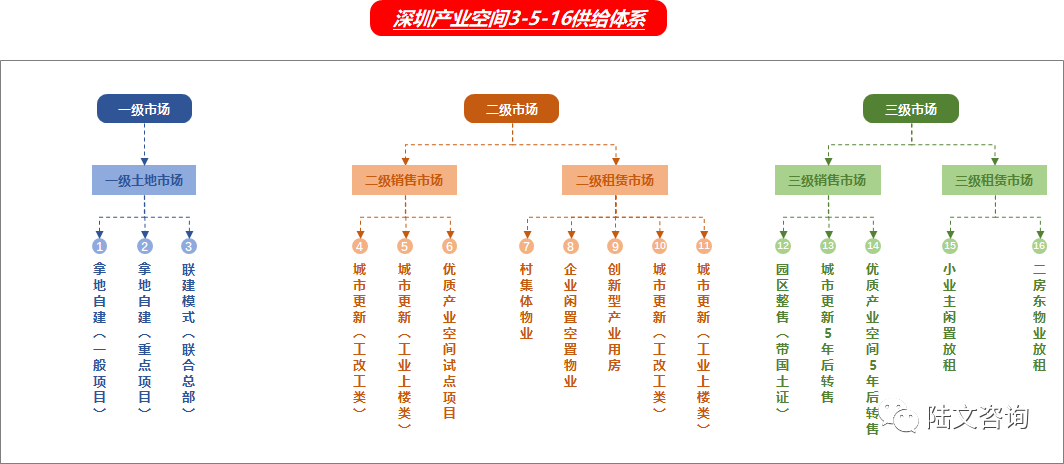 上面这张图是笔者根据目前深圳市场及政策环境下的3-5-16深圳产业空间供给体系,从架构来看,可以分为一级土地市场和二三级销售/租赁市场,其中: