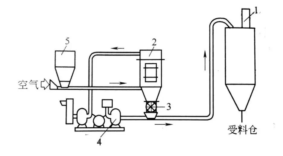 1-受料仓 2-分离器 3-卸料器 4-气源设备 5-供料仓