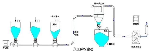 吸气式气力输送, 又称为负压输送。一般在系统管道末端连接真空泵,前段通过吸嘴伸入供料仓内。如图为典型的吸气式气力输送系统,当真空泵开动后, 系统管道内空气被吸走, 两端形成压力差, 粉料在低于大气压力(负压)的条件下被吸入输料管, 最后随着气流输送到分离器,在分离器中,物料与空气分离。被分离出来的物料由分离器底部的旋转式卸料器卸出,而未被分离出来的微细粉粒随气流进入除尘器中净化,净化后的空气可排入大气中。