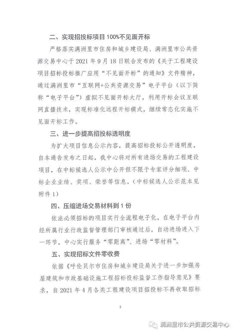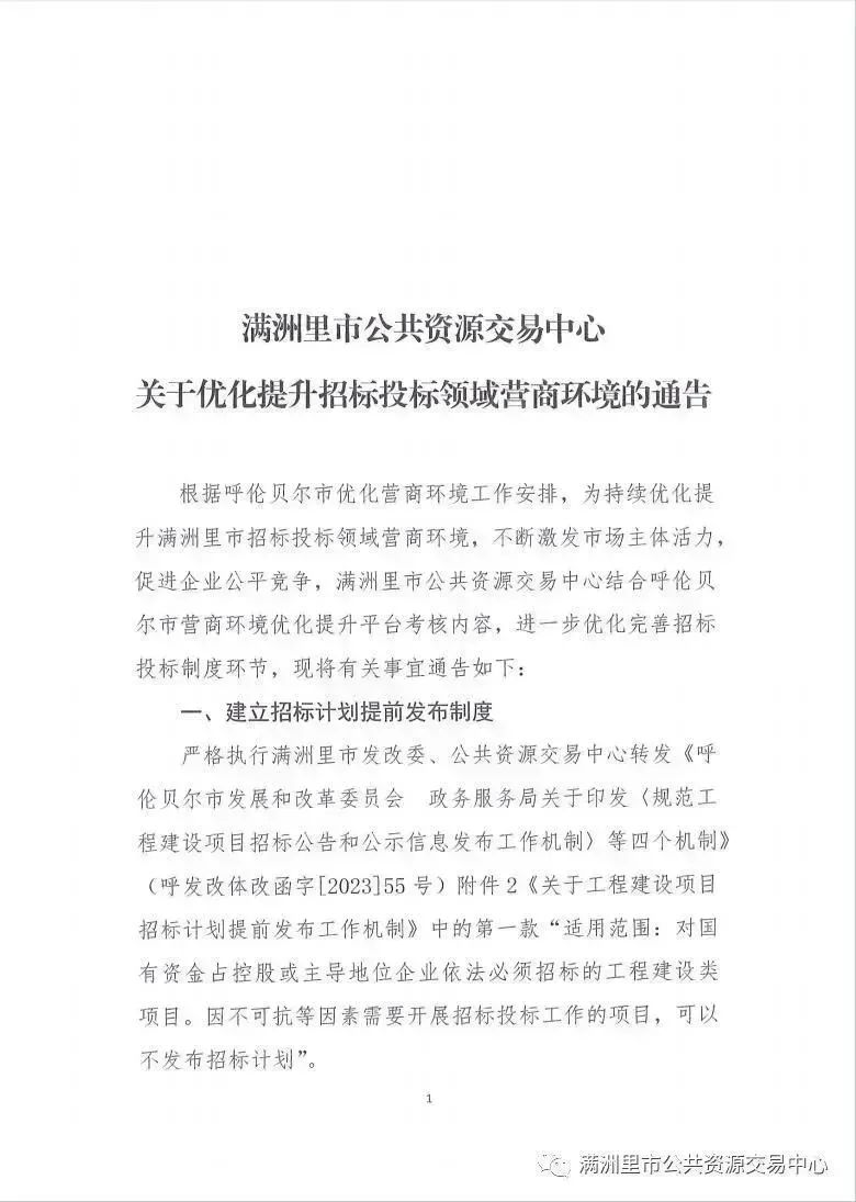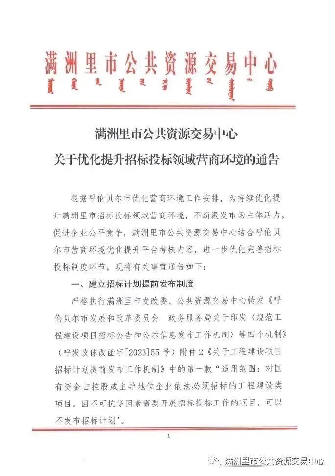 满洲里市公共资源交易中心 关于优化提升招标投标领域营商环境的通告