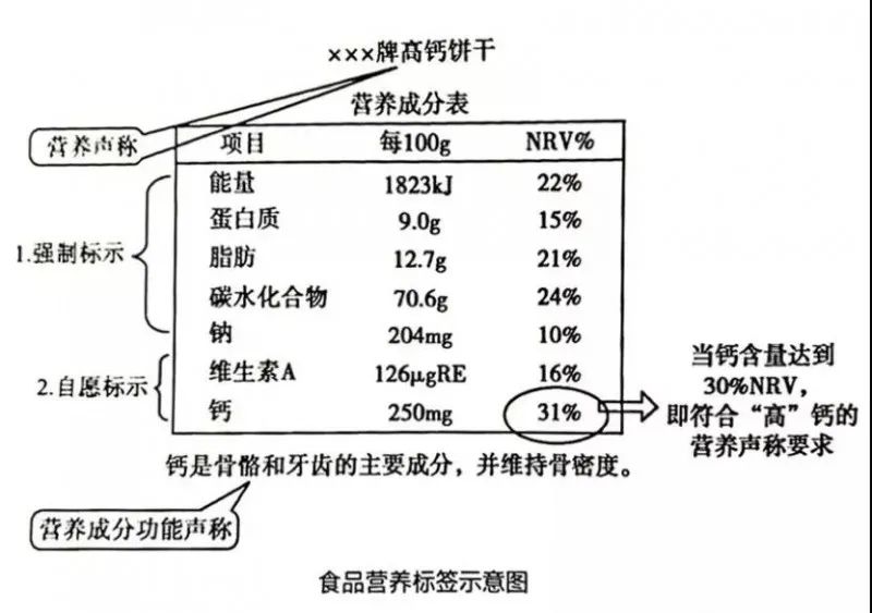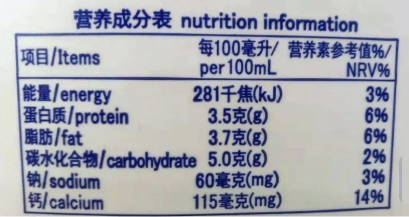 以这一款某品牌牛奶为例,营养成分表中标明了每100毫升的营养成分含量,如上图所示,每100mL该牛奶含有能量281kJ、3.5g蛋白质、3.7g脂肪、5.0g碳水化合物、60mg钠以及115mg钙。 注意:看营养成分表时要先明确“单位重量”,才能对食品所含营养素进行正确评估。一般包装食品的营养成分表都是以每100克(g)或100毫升(mL)为单位标注的,不过也有按每份为单位的,所以一定要看清。 NRV%,简单来说就是指每100克、100毫升或每份食物中,所含营养成分的含量占营养素参考值(NRV)百分比。 除了这三列内容外,我国国家标准还对营养和营养成分功能声称做出了规范: 在某些食品包装上,我们会发现类似“高”、“低”、“无”、“增加”、“减少”、“含有”、“富含”等字样,如高钙豆粉、低脂牛奶、无糖口香糖、含有膳食纤维、富含维生素A等,这些统称为“营养声称”。营养声称是基于营养成分表中的含量数值达到我国规定的一定要求后,用消费者更明白的语言,对营养成分的含量水平进行通俗化的描述。营养声称包含含量声称和比较声称。其中,“含有”、“高”、“低”或“无”属于含量声称;“增加”或“减少”属于比较声称,即通过跟同类产品的比较而得出的。这些标识有利于消费者迅速选购食品。 营养成分功能声称是指采用规定用语说明某营养成分可以维持人体正常生长、发育和正常生理功能等作用。 例如:“维生素C有抗氧化作用”、“钙是骨骼和牙齿的主要成分,并维持骨密度”等。这样的方式能对消费者起到更好的科普教育作用,也是对整个食品营养作用的概括和总结。 无论是营养声称还是营养成分功能声称,都必须严格按照《预包装食品营养标签通则》(GB 28050-2011)的规定标示,不能夸大或虚假声称。 这里我们需要警惕,有些时候,只要含量低于某个标准就可以“声称”。比如固体或液体食品中每100克或100毫升的含糖量≤0.5克时,就可以声称“无糖”;如果每100克食品中反式脂肪的含量不超过0.3克,那就可以标注为“0”。所以有时候配料表里面有糖类,但声称却是“无糖”;“0反式脂肪酸”也不代表这款零食完全安全可以大量吃。如果家长没有注意营养声称的范围,毫无防备地给孩子过多的零食,反而让孩子摄取了更多糖类和反式脂肪酸。因此一定要结合配料表进行选择。文章来源:上海海关12360热线微信号,仅供参考