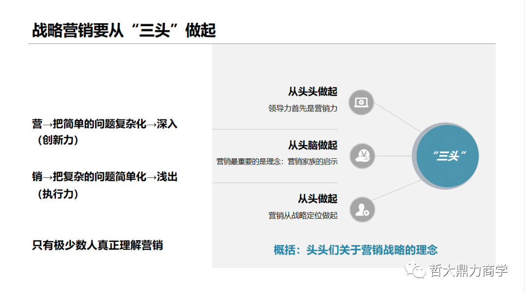 潘老师首先讲到:营销要从“三头”做起:领导(头头)、理念(头脑)、战略(从头做起)。营销的理念错了,一切都将无从谈起。其次,潘老师指出:营销理念和方法论的不断演进告诉我们,营销心智时代已经到来!营销之争不仅是产品之争、广告之争、费用之争,更是心智之争,竞争的战场不在市场,而在消费者的心智。