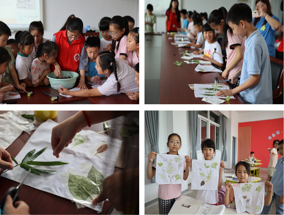 枝叶交错,纹理纵横交织;自然之美,传统艺术流传。活动开始前,团队成员提前收集鲜艳的花朵、各式的树叶作为创作材料,让学生们感受自然之美,用拓染的方式保存自然的印记。活动过程中,在团队成员带领下,小朋友们触摸和感受不同植物的质地和形状,认真学习如何选择适合拓染的植物以及拓染制作步骤,在对拓染有了一定的了解后开始拓染的手工体验。大家认真挑选自己喜欢的植物,充分发挥想象力设计排列布局,小心翼翼地粘贴染材,在敲敲打打的声音中,植物的脉络清晰呈现在布面上。最后作品展示环节,小朋友们举着各具特色的拓染作品,脸上洋溢着喜悦的笑容。