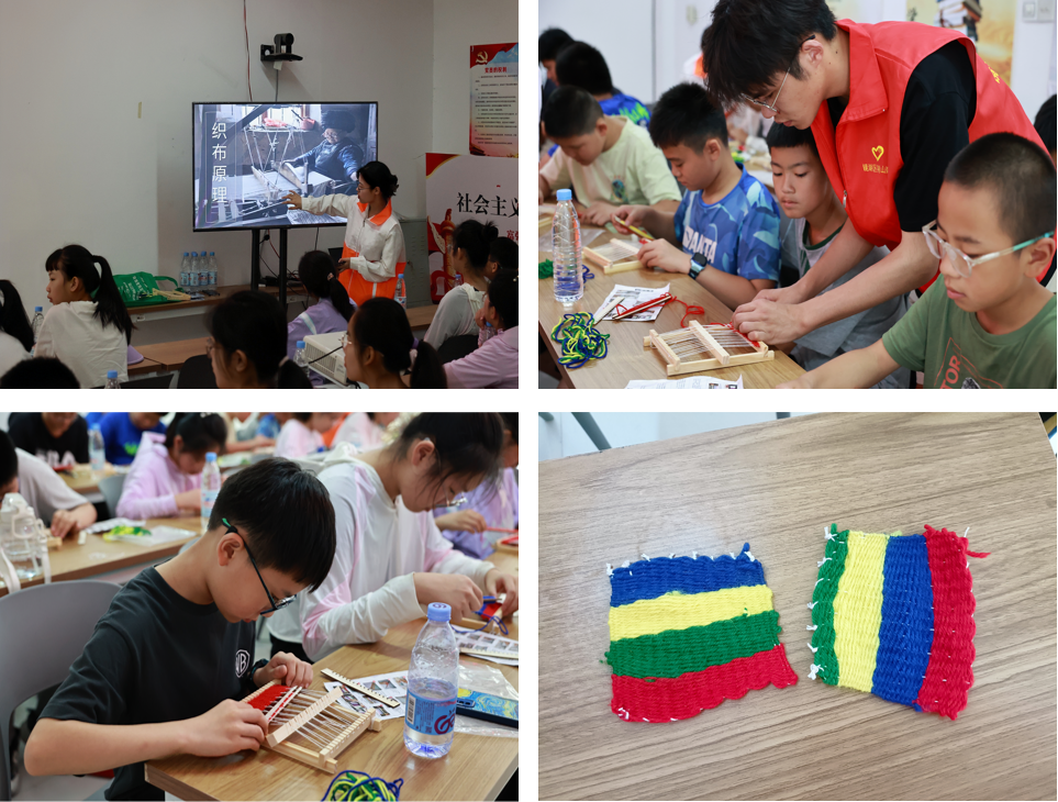 彩线穿梭织古今,经纬交错创未来。活动中,团队成员余心怡、孙紫薇向小朋友们讲述织布机的历史,讲解织布机的构造、作用原理,最后教小朋友们如何使用简易织布机织出布片。小朋友们在充分掌握织布的正确步骤后,手中拿着不同颜色的毛线梭子,忙碌地穿插在小小的织布机里,细致地运用毛线色彩的搭配,在团队成员帮助下,认真地穿线、拉线,最终形成一张张精美的布块。