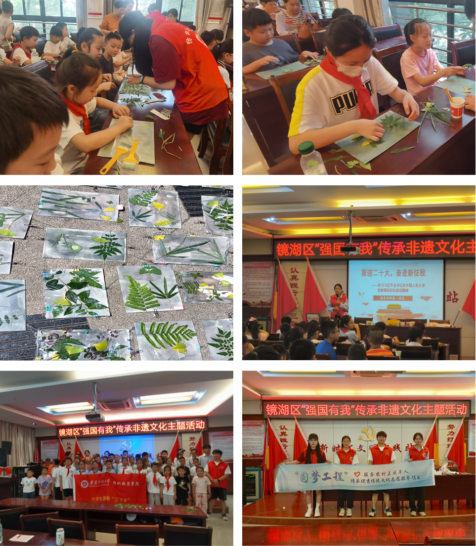 为进一步加强未成年人思想引领,大力弘扬中华优秀传统文化,铸牢中华民族共同体意识,激发小朋友们对非物质文化遗产的浓厚兴趣。在2023年“圆梦工程”服务农村未成年人传承优秀传统文化志愿服务项目指导下,7月24日起,安徽工程大学“岁韵留存 布上生花”志愿服务队依次前往芜湖市棠梅社区、荆山小学、凯旋社区,开展非遗手工体验志愿服务活动,以沉浸式体验鼓励儿童发展他们的创造力,感受优秀传统文化的魅力。