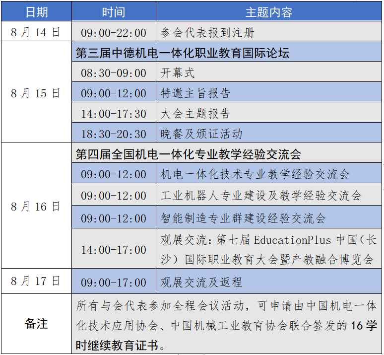 为深入学习贯彻党的二十大精神和习近平总书记关于职业教育工作的重要指示批示,落实中共中央办公厅、国务院办公厅《关于深化现代职业教育体系建设改革的意见》,夯实现代职业教育类型特色,促进中德两国在工业4.0与智能制造职业教育领域的交流,加强中德两国在机电专业高技能人才培养领域的合作,提升职业教育服务支撑高质量发展的能力,由中国机电一体化技术应用协会、中国机械工业教育协会联合主办的“第三届中德机电一体化职业教育国际论坛暨第四届全国机电一体化专业教学经验交流会”定于2023年8月中旬在长沙“第七届EducationPlus中国(长沙)国际职业教育大会暨产教融合博览会”期间举办。现将有关会议事项通知如下: