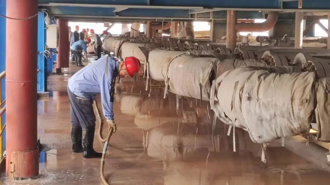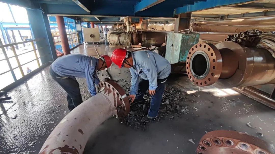 13:40,C沉降稀释前泵出料管道运至清洗现场,刚清洗完VWT段弯头的清洗小组又投入到新的战斗,他们根据管道长度和现场旋管器位置摆放好待清洗的管道,做好周边的防护隔离后展开作业,随着高压水的打击,大块的结疤从管道另一段不断飞溅而出,经过反复几次清洗之后,管道内壁变得的干干净净。
