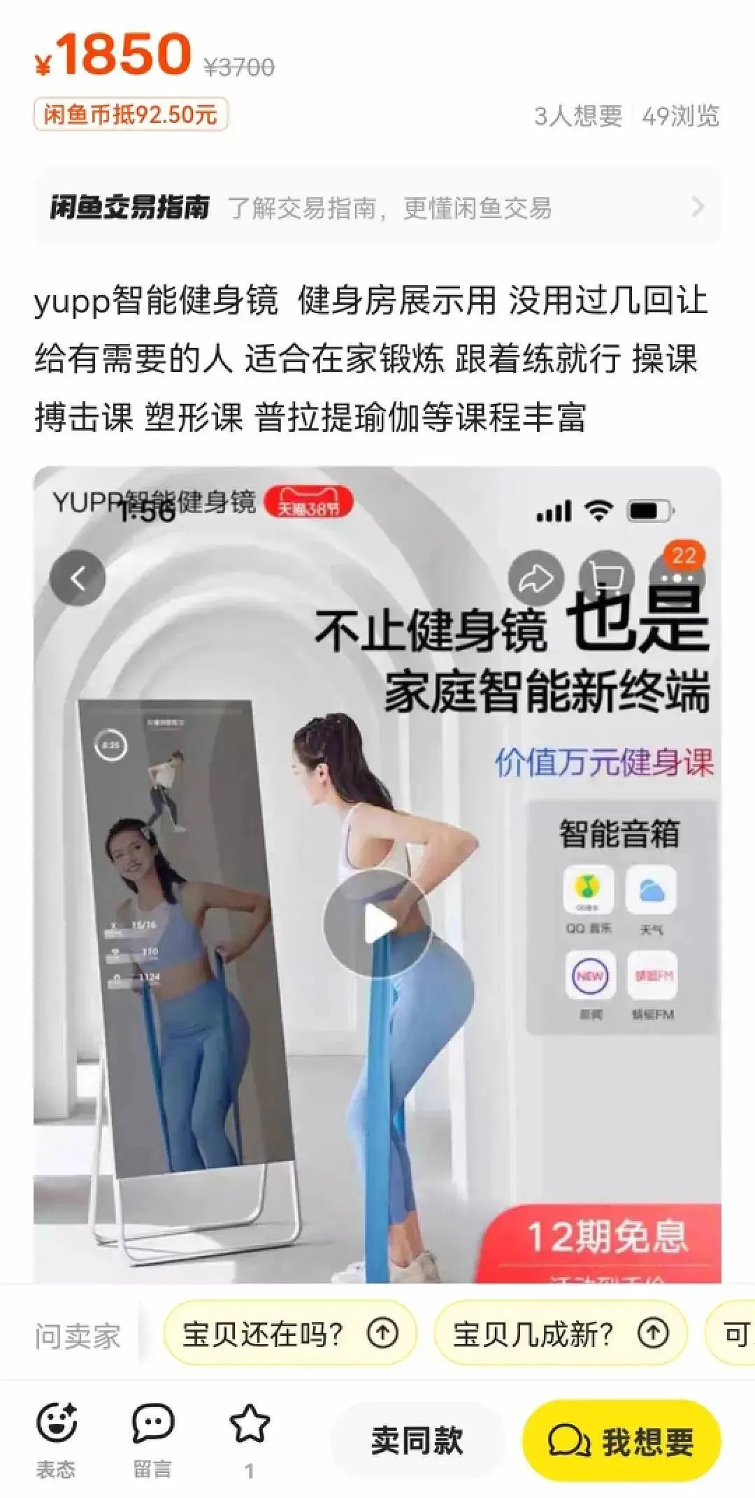 只是如今它被挂上闲鱼快一年了,几乎全新的健身镜,我标价从2500元降到1800元,甚至好几次,砍价砍到1200元我也愿意接受,但无奈镜子太大,搬运、拉走都是难题,所以总是问的人多,买的人少。