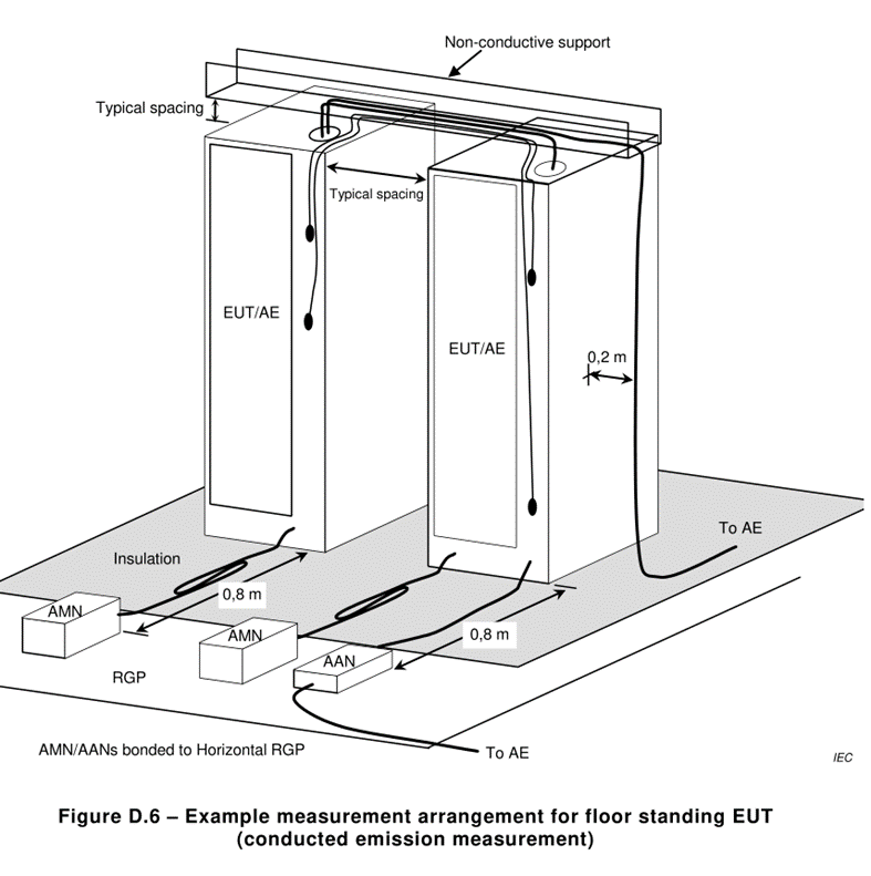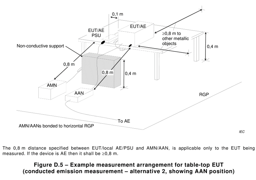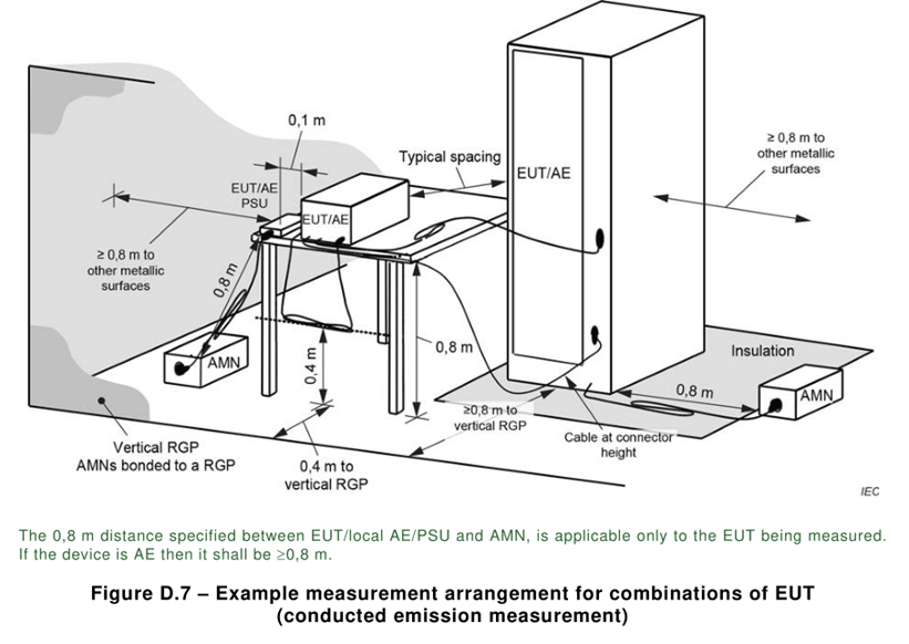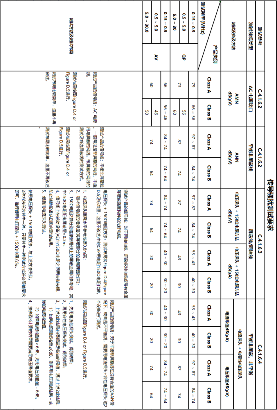 5.1、传导发射骚扰:频率在0.15k~30MHz骚扰主要是通过线缆的方式进行传输,因此进行线缆上的骚扰测试。该测试一般是测AC电源端口和信号/控制线,其他光纤、射频调制输出端、广播接收机调谐器和天线端口暂不叙述。文字看起来枯燥,这里直接上表格和布局图。