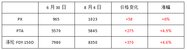 从6月30日至8月4日,PX外盘价格从965美元/吨上涨到1023美元/吨,上涨了58元/吨,涨幅为6%;PTA内盘价格从5570元/吨上涨到5845元/吨,上涨275元/吨,涨幅为4.9%;涤纶长丝FDY150D则是从7980元/吨上涨到8350元/吨,上涨了370元,涨幅为4.6%。