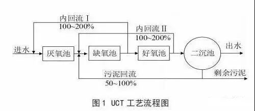 (2)UCT 工艺。A2O工艺的基础上增加缺氧混合液回流,且二沉池外回流污泥回到缺氧池即为传统的UCT工艺。这样在冬季水温较低的情况下,确保系统达到较好的除磷效果。UCT工艺流程如图 1 所示。
