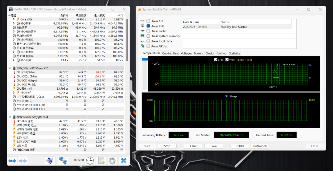 这款机器在AIDA64的FPU单烤测试下,CPU瞬间最高可达98W,然后很快便会回落并稳定到80W~84W之间,此时温度95摄氏度以内,CPU主频则能维持在4.3GHz左右。