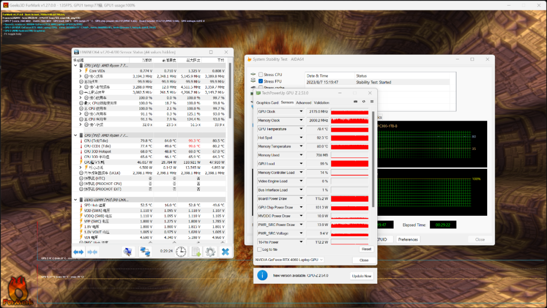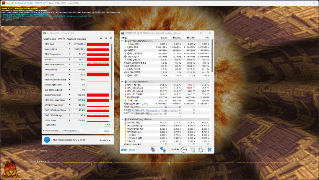 在FurMark的单烤中,RTX 4060独显可以稳成140W一条直线,GPU温度控制到80度以内,核心频率2200MHz左右。
