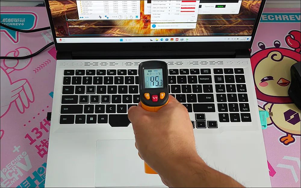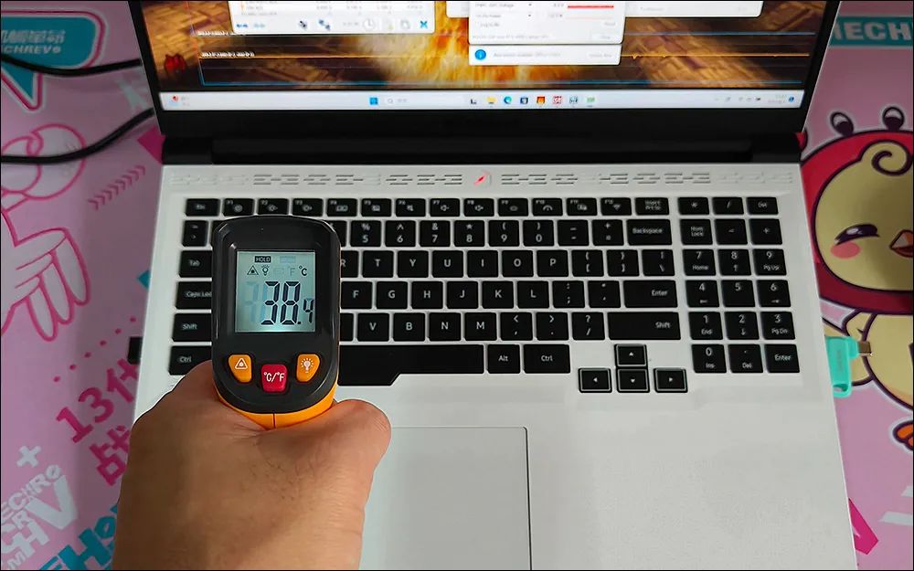 此时WASD按键区域的温度在38度左右,C面最高温位于中间偏上的区域,45度,掌托触控板等位置则非常清凉。