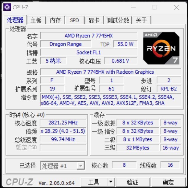 这款蛟龙16 Pro搭载AMD锐龙7 7745HX处理器,这颗芯片采用台积电5nm制程工艺,Zen4+RDNA2微架构的组合,8大核16线程,较之同价位游戏本常用的锐龙7 7840H处理器,核显缩水,但却塞进了更大的40MB高速缓存(L2和L3分别为8MB和32MB),理论上大缓存对游戏的增益效果更明显。