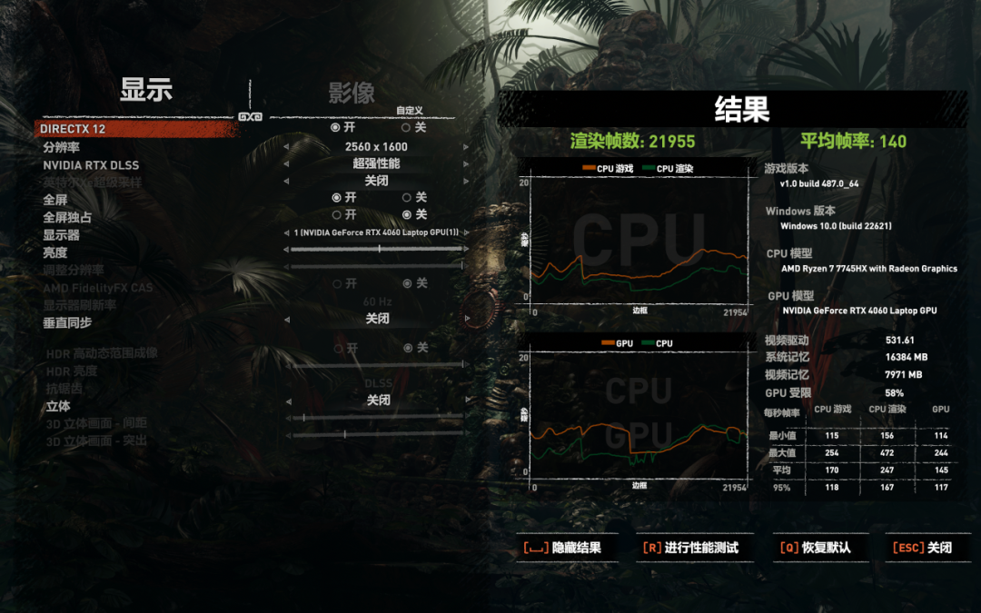 不过,RTX 4060还有一个必杀技,那就是支持DLSS 3技术,可以大幅提升开启光追特效后的游戏帧数。以《古墓丽影 暗影》为例,在2K分辨率最高画质并打开超高级别的光线追踪质量时,平局帧数只有60FPS。
