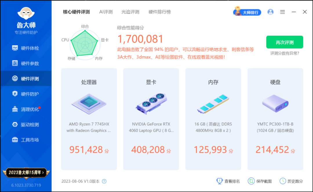 在鲁大师中,蛟龙16 Pro的总分超过了170万大关,击败了全国94%的电脑,对于一款6999元的游戏本来说已经足够傲娇了。
