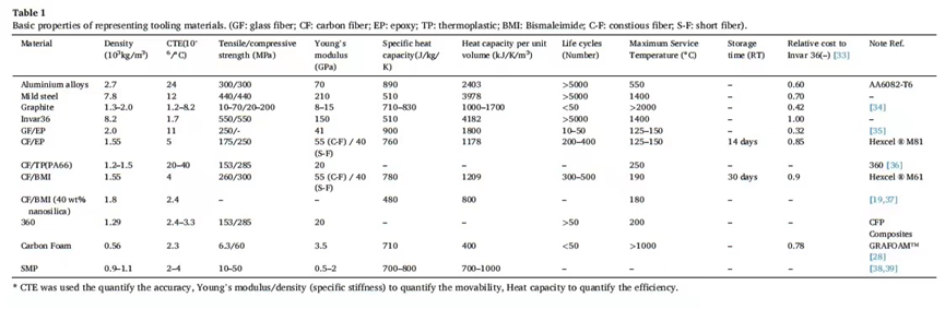 耐高温热塑性树脂材料也被报道为CF/EP复合材料的使用的模具材料结构。最近,CFP复合材料公司开发了一种新的模具材料,该材料由短切碳纤维与PA66树脂混合制成,据报道,PA66树脂可承受高达200°C的热循环,且完全可加工。然而,热塑性树脂的CTE比热固性树脂的高,这对材料制造精度是有害的。此外,对其成本和热性能的相关研究相对较少,其大规模生产能力也没有相关报道。