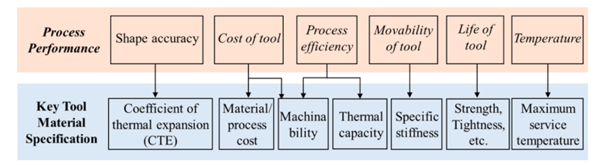 模具制造都经历相同的热循环和负载循环,复合材料制品在固化过程中的性能以及模具所使用的材料直接影响制造过程和相应产品的性能。图2总结了与复合材料制造工艺和产品性能相关的模具材料的关键性能和规格,具体在下文中讨论。