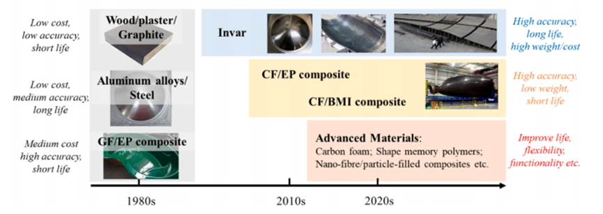 20世纪90年代,随着全球对飞机需求量的显著增长,大规模生产具有精确气动表面的复合材料结构成为一项新的挑战。提出了对模具有类似复合材料结构和CTE的模具材料固化和耐久性研究。1896年发现的具有“因瓦效应”的镍铁合金,其在特定镍含量下可实现非常低的CTE,成为航空航天工业中复合材料制造的合适工具材料。然而,因瓦合金的缺点是重量大,在模具制造和应用中,难加工和成本高等问题,特别是对于低成本的大型复合材料结构要求,使得研究人员重新寻找新的轻型并具有更长固化时间的复合材料。2000年左右,新型碳纤维增强复合材料和改性树脂被专门开发用于复合材料模具,例如双马来酰亚胺树脂基的复合材料Hexcel M61模具,在高达175–180°C的温度下,能够承受300次以上的固化循环。