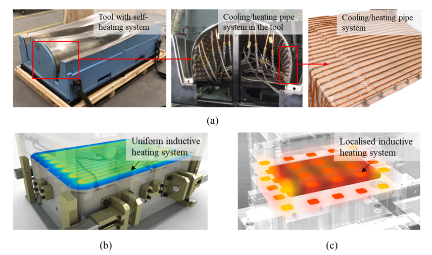 由于高压釜或烘箱中复合材料生产的长期固化过程所需的高温和/或压力环境是通过加热循环空气或氮气来提供的,因此需要连续加热大量的空气或氮气(甚至达到几千立方米),这是极其昂贵的,也限制了生产效率。该问题的一个较为流行的解决方案是开发具有自热功能的模具,在过去十年中,已经在这一领域进行了许多试验。在金属成形领域开发具有加热和冷却功能的模具有着悠久的历史,其使用内部有热/冷水或油的管道系统来提供自加热功能,这种技术也在复合材料制造中得到了长期的应用。韦伯制造技术公司开发了一种类似的模具,并将其应用于汽车中的复合材料制造,以降低成本,图16(a)展示了一个样品。另一种加热方法为感应加热,具有比传统的热水或油有更高的热效率,也被用来建造自加热模具,用于大批量制造复合材料产品。罗斯蒂公司通过将电磁感应加热系统集成到模具内部,开发了一种自加热模具,其与模具的形状相匹配,如图16(b)所示。据报道,它有能力将加热固化的时间从高压釜中的1小时减少到2分钟,然而,在如此高的加热速率下,温度分布的均匀性可能是一个问题。另一个模具系统通过开发带有电感器的局部加热系统,进一步推动了该技术的发展,实现了组件不同区域的局部加热/冷却控制,实现了对具有不同厚度和形状条件的组件的均匀热控制。图16(c)显示了Surface Generation公司开发的演示模具。这些集成到模具中的额外加热系统将显著提高复合材料制造过程的适应性(自由和快速地控制温度分布)和效率。然而,它们也会同时大大增加模具在结构和制造方面的复杂性,进而可能会带来模具的可靠性问题,特别是对于航空航天工业中的大型和特大型部件的制造。