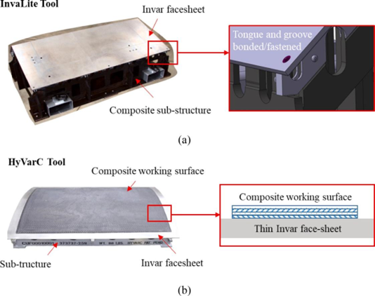 图13 使用因瓦合金和复合材料的两组复合模具概念的比较(a)复合材料基底+因瓦合金面板和(b)因瓦合金基底+复合材料面板。