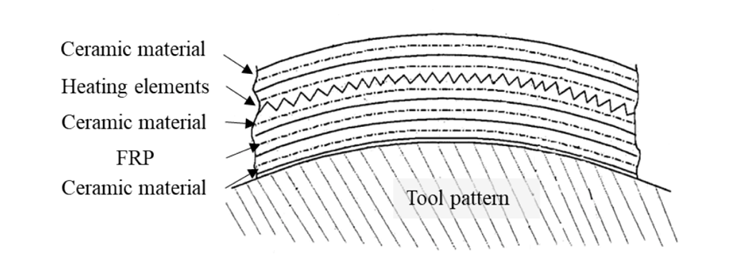 此外,开发具有直接嵌入加热元件的新模具材料是实现自加热功能的另一种方法,最近引起了大家越来越多的兴趣。图17显示了Doyle等人报道的具有嵌入式加热元件(电阻丝)的典型自加热模具示意图。电阻丝用低热膨胀系数陶瓷胶结物嵌入,并添加高性能热塑性聚合物(聚醚醚酮)的粘合剂层,以连接CF增强物和陶瓷组。热塑性组件的加热能力已有报道,然而,其在热固性复合材料的长期高温和高压条件下固化中的应用还没有报道,纳米技术也被应用于使模具的自加热功能,其中碳纳米管由于其在电、热甚至机械性能方面的改进而被使用。Boyce等人报道了一种自加热模具,该模具由导电模具表面和分散的碳纳米管组成,分布的铝电极埋入并绝缘在纤维玻璃和树脂复合材料的较低层中,通过向电极施加电压,可以产生电流并通过碳纳米管快速加热模具表面。