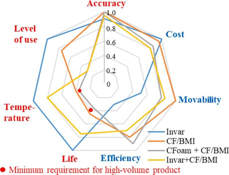 图14比较了具有复合材料和单一材料(如因瓦合金和CF/BMI复合材料)的模具的性能。通过将碳泡沫与复合材料相结合,由于碳泡沫具有良好的可加工性,复合材料模具的效率可以提高,但由于复合材料面板的特性,其温度和寿命性能仍然受到限制。