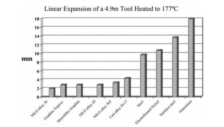 航空航天复合材料产品的关键要求之一是精准度高。根据这一要求,复合材料中的模具材料制造业从铝和钢发展到因瓦合金和复合材料的模具,与复合材料CTE更接近的产品。Smith等人已经给出了长度为4.9m并加热至177 ◦C时不同模具材料的总热膨胀,如图4所示。从结果中可以看出,铝合金模具引起的变形约为10mm,约为因瓦合金或石墨环氧树脂的两倍。