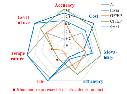 图5 复合材料制造工艺中不同传统模具材料的性能比较
