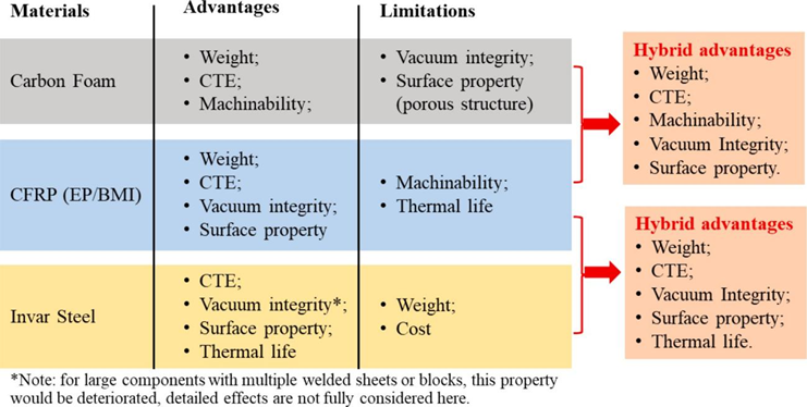 图11.低热膨胀系数的典型工具材料的优势和局限性,以及不同材料组合时相应的复合优势。