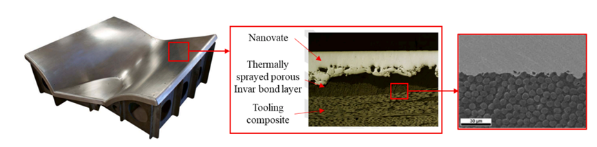 除热性能外,强度和寿命性能也是限制复合材料模具应用的关键因素。人们发现,纳米技术是显著提高复合材料强度和机械性能的潜在途径, 近十年来已被用于硬化和延长复合材料模具的寿命。通过将这种纳米结构合金涂覆到碳纤维复合材料制成的模具表面上,可以同时实现轻质、低热膨胀系数和高耐久性。通过热喷涂多孔因瓦合金粘结层,与复合材料模具底座之间实现了良好的粘结,如图18所示。它是一种有前途的技术,可用于制造具有良好重量、热和机械性能的模具,特别是用于航空航天工业。该材料仍在开发中,将进一步调整热膨胀系数以实现与复合材料产品的合理匹配,优化涂层方法以实现复杂结构的均匀厚度表面,降低材料和工艺成本是未来的研究方向。